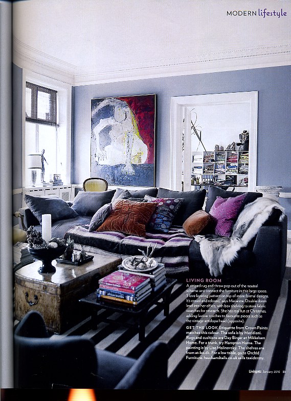 The Copenhagen home of Marianne Brandi and Keld Mikkelsen was in the January issue of Living Etc. I love the mixtures of rich textiles, bold stripes a few bright colors and touches of gleaming silver. They are designer and creative director of Day Birger Mikkelsen, the Danish fashion and home company, so many of the cushions and accessories are part of their line. I also think it's incredible that this apartment is part of a purpose-built block! I don't know where you live, but in London, purpose-built housing certainly doesn't normally feature period crown molding, huge windows and high ceilings!